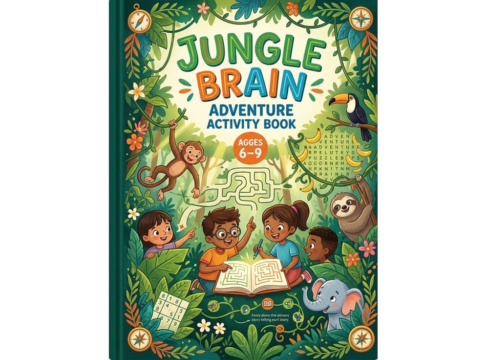 The project I created was called “Jungle Brain Adventure Activity Book”. I designed it for kids around ages 6–9, and I wanted it to feel like a mix of fun puzzles and a small adventure story rather than just random pages put together.