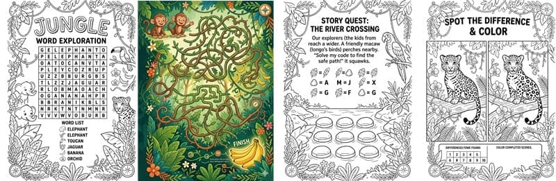One feature I ended up using more than I expected was the Illustrated Maze AI. I generated a few jungle-themed maze pages, and visually they looked more interesting than the typical black-and-white maze pages you usually see in many puzzle books.